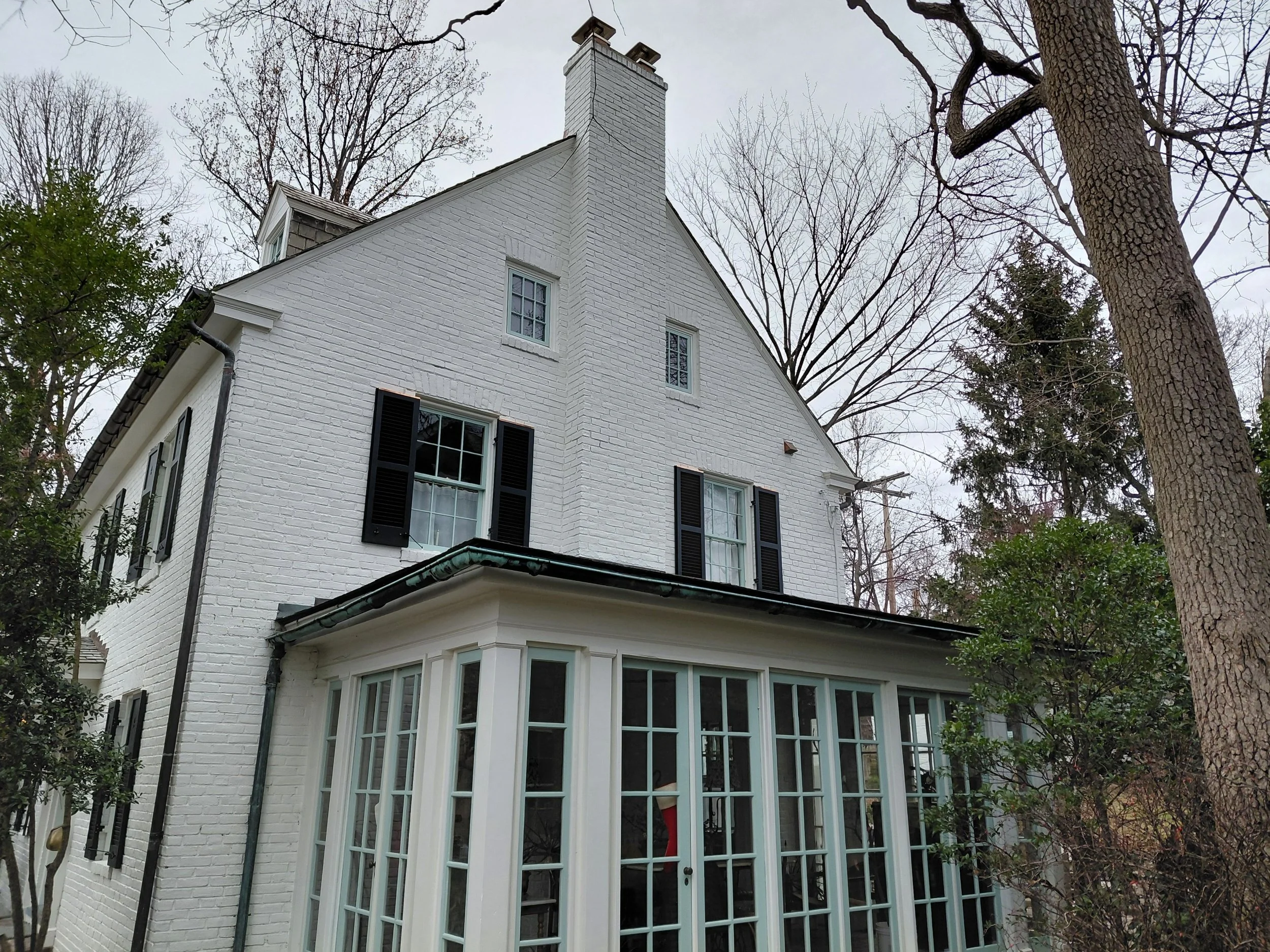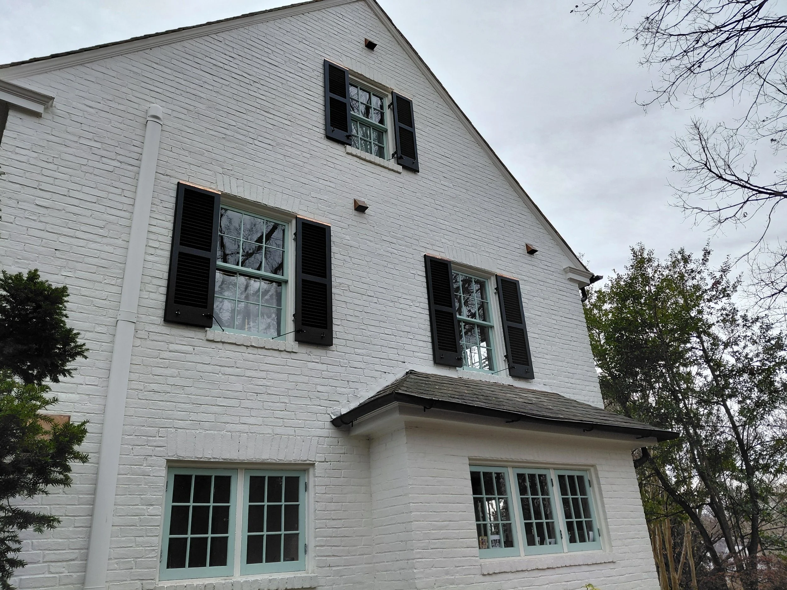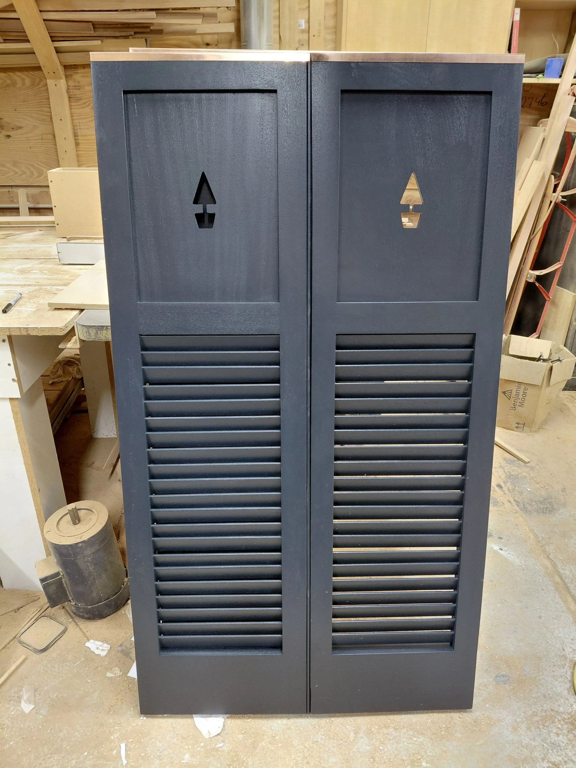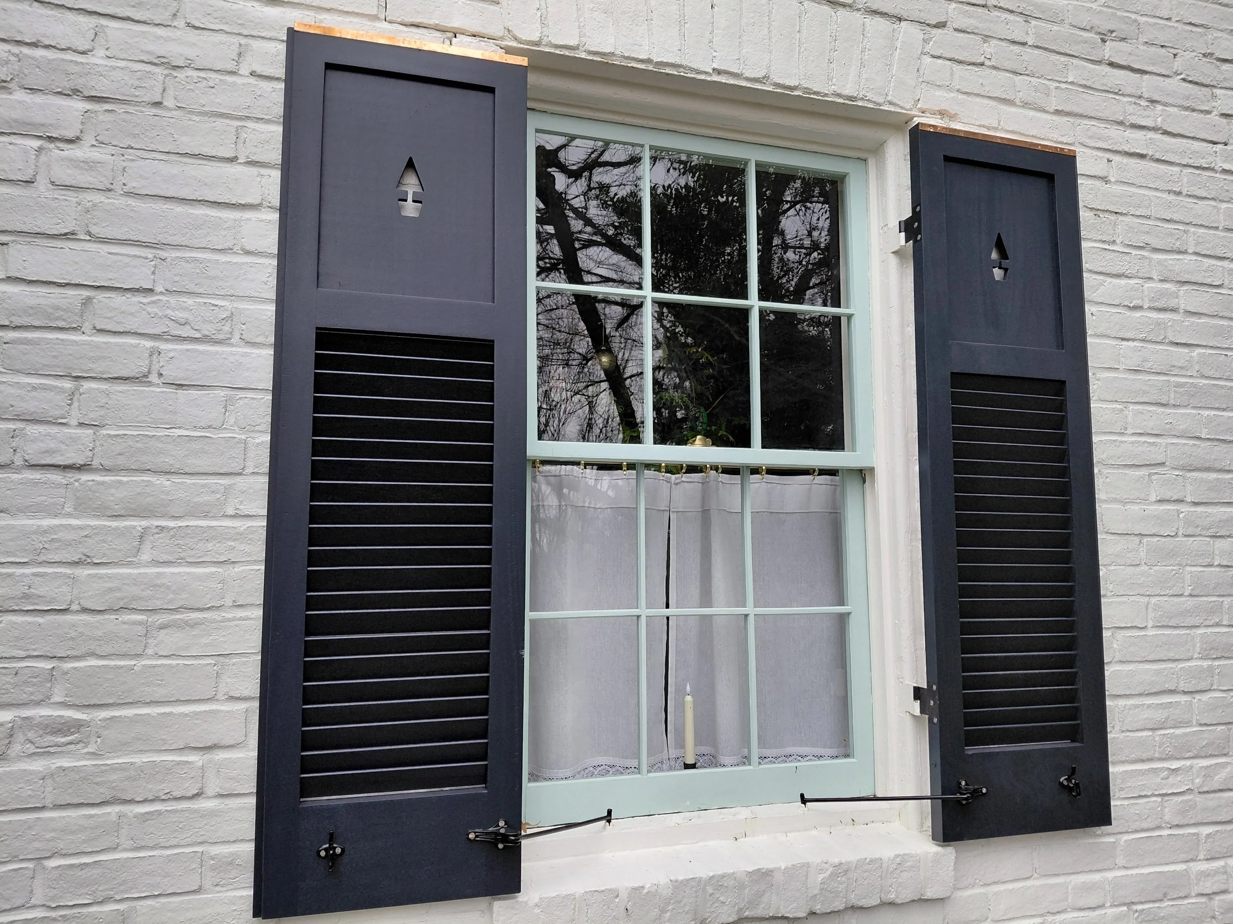 1/4 sawn Sapele shutters, copper.caps, with a topiary motif. Wrapped up at the end of 2025. Check it out!